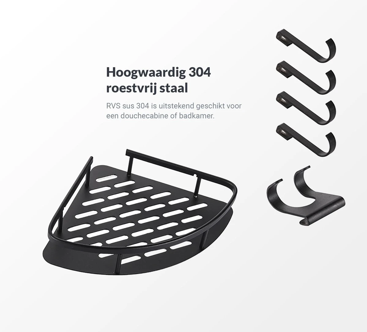 De mat zwarte look komt uitstekend uit bij elke muur. Uiteraard is deze prachtige set gemaakt van sus 304 roestvrij staal. Het mooiste van alles is dat je niet hoeft te boren. Binnen 5 minuten hangen deze rekjes in jouw douche.