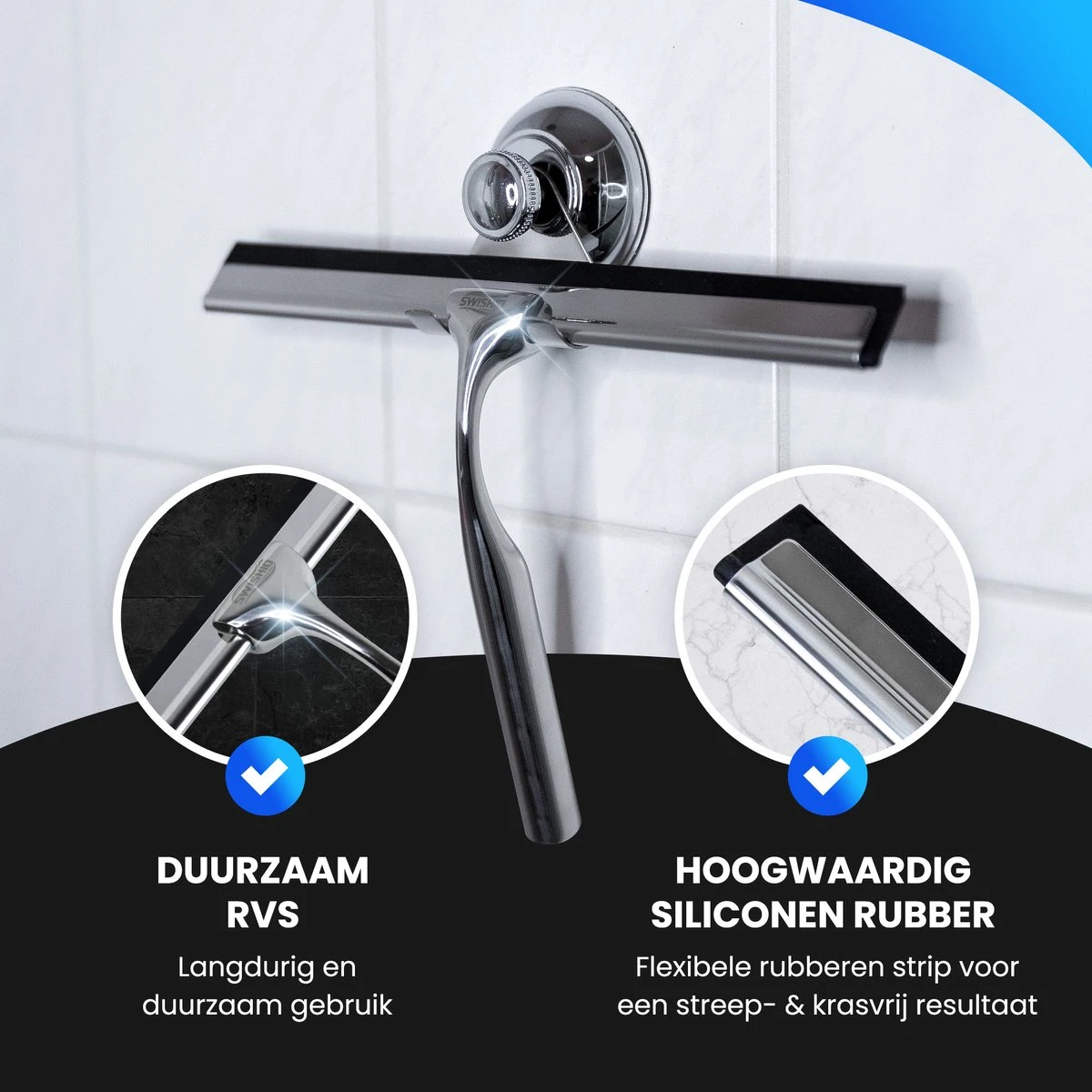 Ben jij kalkvlekken en strepen op je raam ook helemaal zat? Onze raamwisser maakt hier onmiddellijk een einde aan! Maak je ramen eenvoudig en effectief schoon met de Swishio raamwisser. De flexibele siliconen strip zorgt voor een druppel- en streepvrij reinigingsresultaat. De douchewisser is gemaakt van hoogwaardig roestvrijstaal. Met de zelfklevende ophanghaak is de raamwisser eenvoudig op te bergen. Een handig hulpmiddel voor in jouw badkamer!