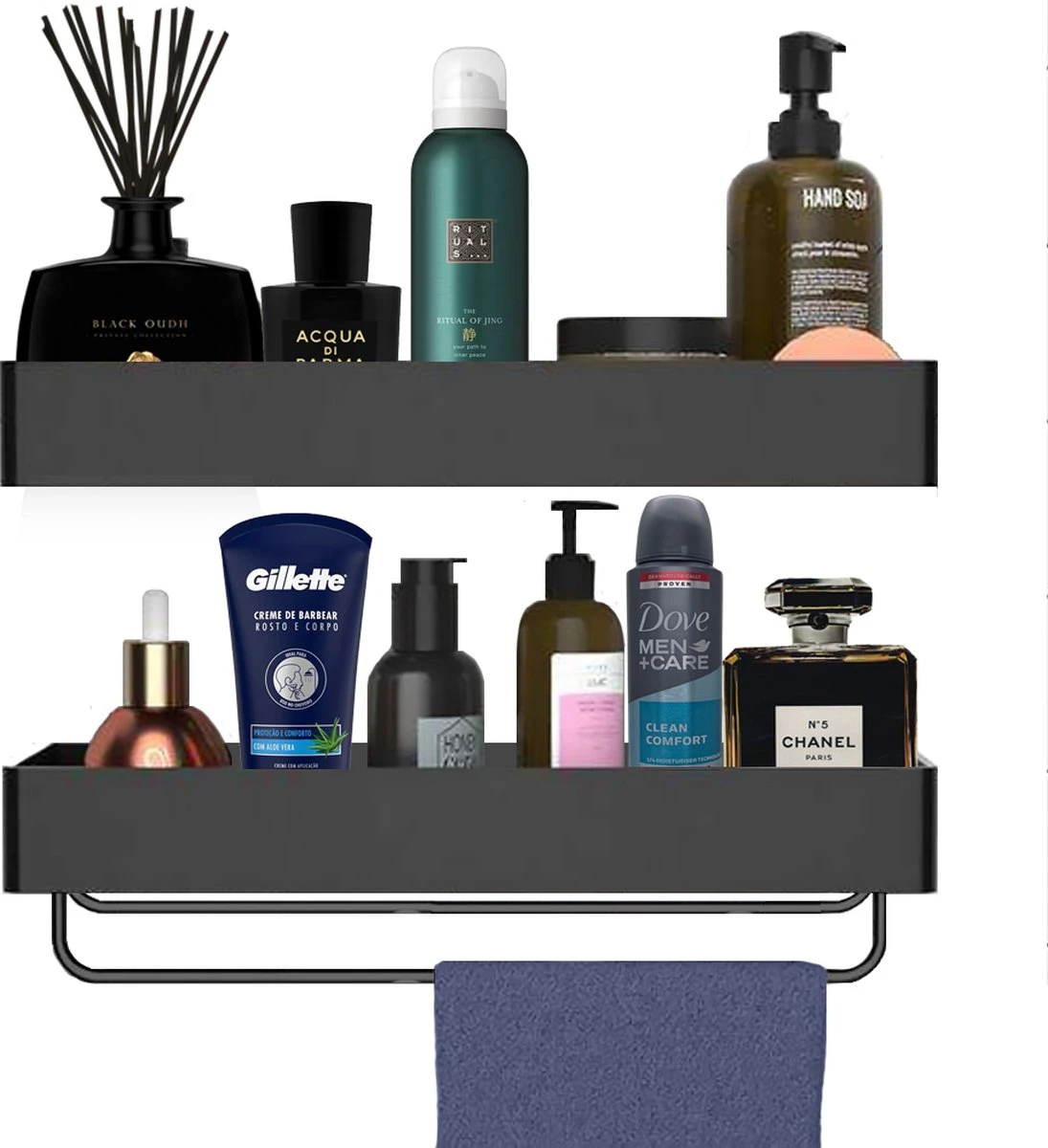 Het doucherek bestaat uit 2 verschillende lagen die beide 40 cm breed zijn. Op het rek kun je verschillende flessen, zeepjes, scheermesjes, tandenborstel en andere spulletje kwijt. Het onderste rekje is daarnaast voorzien van een extra stang waar je een handdoek aan op kunt hangen.
