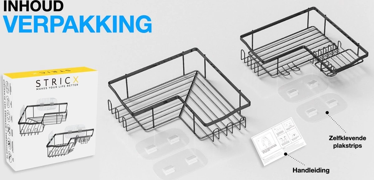 STRICX Doucherekhoek 2 Laags Zwart – Zonder Boren – Zelfklevend Doucherek – Doucherek – Doucherek Voor Badkamer/ Keuken – Doucherek Met Plakstrip – Keukenrek Met Plakstrip – Badrek Douche – Doucherek Hoekvorm – Badkamerrek Douchemandje