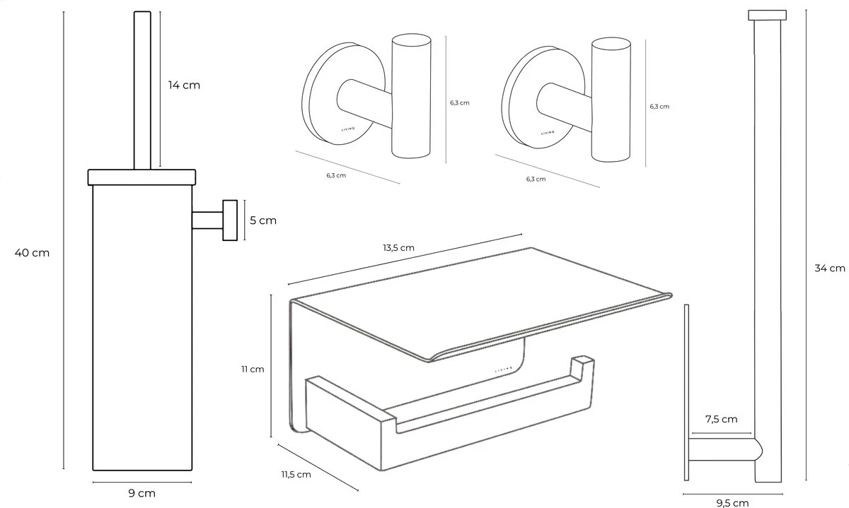 Accessoireset met: Toiletborstelhouder, Toiletrolhouder, Reserverolhouder, Handdoekhaak